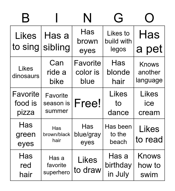 This bingo card has a free space and 25 words: Has brown/black hair, Likes to draw, Favorite color is blue, Has red hair, Has a pet, Likes to sing, Likes dinosaurs, Has a sibling, Likes to dance, Has blue/gray eyes, Has blonde hair, Favorite food is pizza, Has been to the beach, Likes to read, Can ride a bike, Knows how to tie their shoes, Likes ice cream, Has brown eyes, Knows another language, Favorite season is summer, Knows how to swim, Has a favorite superhero, Has green eyes, Likes to build with legos and Has a birthday in July.