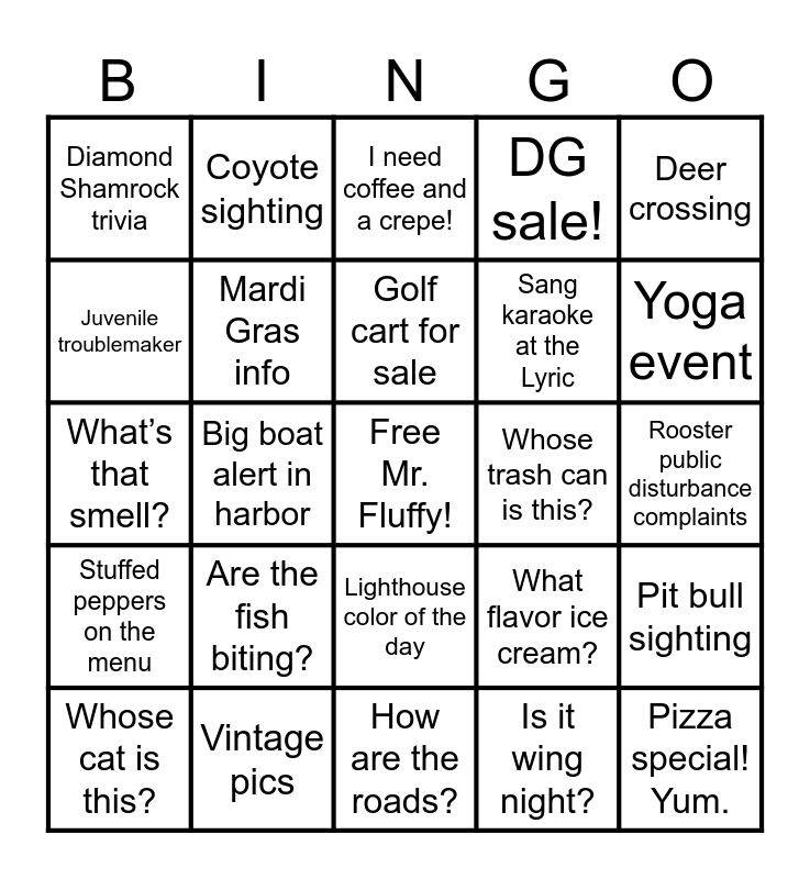 This bingo card has a free space and 24 words: Are the fish biting?, Vintage pics, Golf cart for sale, Whose cat is this?, Deer crossing, Diamond Shamrock trivia, Juvenile troublemaker, Coyote sighting, Whose trash can is this?, Lighthouse color of the day, Sang karaoke at the Lyric, What’s that smell?, What flavor ice cream?, Pit bull sighting, Mardi Gras info, Is it wing night?, Rooster public disturbance complaints, I need coffee and a crepe!, Yoga event, Big boat alert in harbor, Pizza special! Yum., Stuffed peppers on the menu, DG sale! and How are the roads?.