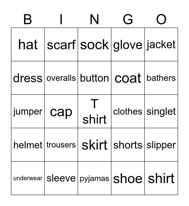 This bingo card has a free space and 24 words: trousers, sleeve, button, underwear, jacket, hat, dress, scarf, clothes, skirt, coat, jumper, shorts, slipper, overalls, shoe, singlet, sock, bathers, cap, shirt, helmet, glove and pyjamas.
