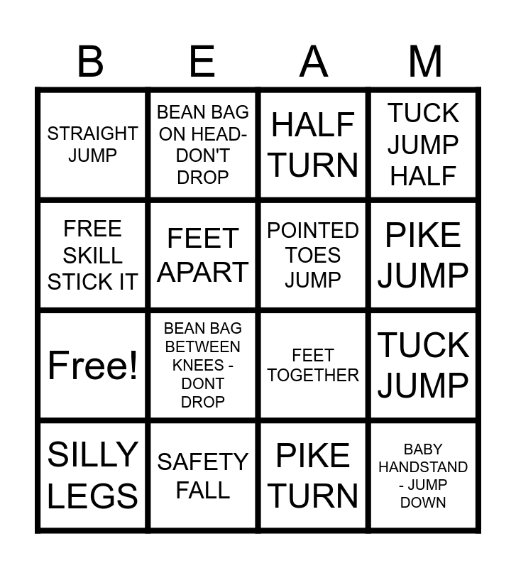 This bingo card has 20 words: TUCK JUMP, STRADDLE JUMP, HALF TURN, FULL TURN, SILLY LEGS, FREE SKILL STICK IT, SAFETY FALL, STRAIGHT JUMP, Free!, BEAN BAG ON HEAD-DON'T DROP, BEAN BAG BETWEEN KNEES - DONT DROP, FEET TOGETHER, FEET APART, BABY HANDSTAND - JUMP DOWN, POINTED TOES JUMP, SPLIT JUMP, PIKE JUMP, TUCK JUMP HALF, PIKE TURN and STAG JUMP.