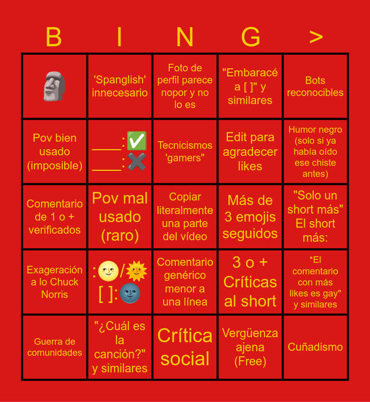 This bingo card has 30 words: "¿Cuál es la canción?" y similares, Come tario repetido (en la misma sección), Pov mal usado (raro), Genuinamente gracioso (dif. extrema), 🗿, Foto de perfil parece nopor y no lo es, ___:✅ ___:✖️, Comentario genérico menor a una línea, Más de 3 emojis seguidos, Crítica social, "Solo un short más" El short más:, Copiar literalmente una parte del vídeo, Vergüenza ajena (Free), Cuñadismo, Humor negro (solo si ya había oído ese chiste antes), "Cine" "🚬", 3 o + Críticas al short, Exageración a lo Chuck Norris, :🌝/🌞 [ ]:🌚, Bots reconocibles, Comentario de 1 o + verificados, Pretextos para que lo fijen, 'Spanglish' innecesario, Edit para agradecer likes, Pov bien usado (imposible), "Embaracé a [ ]" y similares, *El comentario con más likes es gay" y similares, Guerra de comunidades, Tecnicismos 'gamers" and Xenofobia, Humor, México (Las 3 juntas).