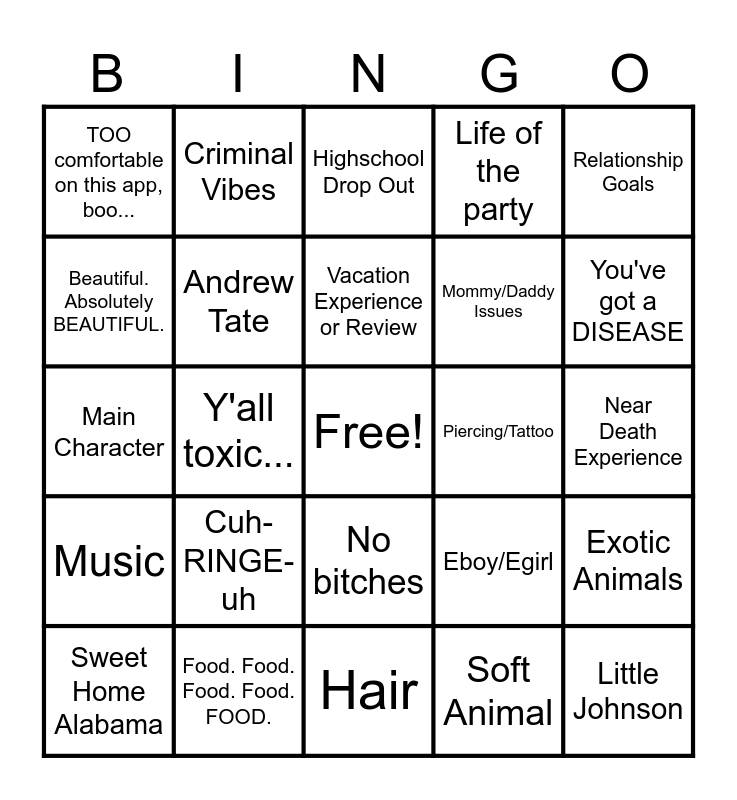 This bingo card has a free space and 24 words: Cuh-RINGE-uh, Food. Food. Food. Food. FOOD., Vacation Experience or Review, Sweet Home Alabama, Relationship Goals, TOO comfortable on this app, boo..., Beautiful. Absolutely BEAUTIFUL., Criminal Vibes, Piercing/Tattoo, No bitches, Mommy/Daddy Issues, Main Character, Eboy/Egirl, Exotic Animals, Andrew Tate, Soft Animal, Near Death Experience, Highschool Drop Out, You've got a DISEASE, Y'all toxic..., Little Johnson, Music, Life of the party and Hair.