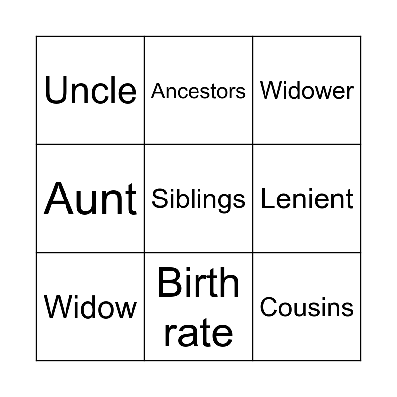 This bingo card has 9 words: Widow, Widower, Ancestors, Aunt, Uncle, Lenient, Siblings, Cousins and Birth rate.