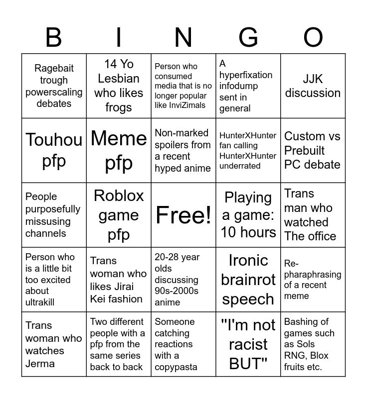 This bingo card has a free space and 24 words: Trans woman who likes Jirai Kei fashion, Two different people with a pfp from the same series back to back, Non-marked spoilers from a recent hyped anime, Trans woman who watches Jerma, JJK discussion, Ragebait trough powerscaling debates, Touhou pfp, 14 Yo Lesbian who likes frogs, Playing a game: 10 hours, 20-28 year olds discussing 90s-2000s anime, HunterXHunter fan calling HunterXHunter underrated, People purposefully missusing channels, Ironic brainrot speech, Re-pharaphrasing of a recent meme, Meme pfp, ''I'm not racist BUT'', Trans man who watched The office, Person who consumed media that is no longer popular like InviZimals, Custom vs Prebuilt PC debate, Roblox game pfp, Bashing of games such as Sols RNG, Blox fruits etc., Person who is a little bit too excited about ultrakill, A hyperfixation infodump sent in general and Someone catching reactions with a copypasta.