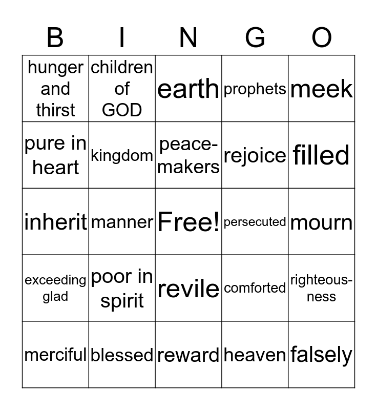 This bingo card has a free space and 24 words: poor in spirit, blessed, peace-makers, merciful, meek, hunger and thirst, pure in heart, children of GOD, persecuted, revile, rejoice, inherit, comforted, righteous- ness, kingdom, heaven, mourn, earth, filled, manner, falsely, exceeding glad, prophets and reward.
