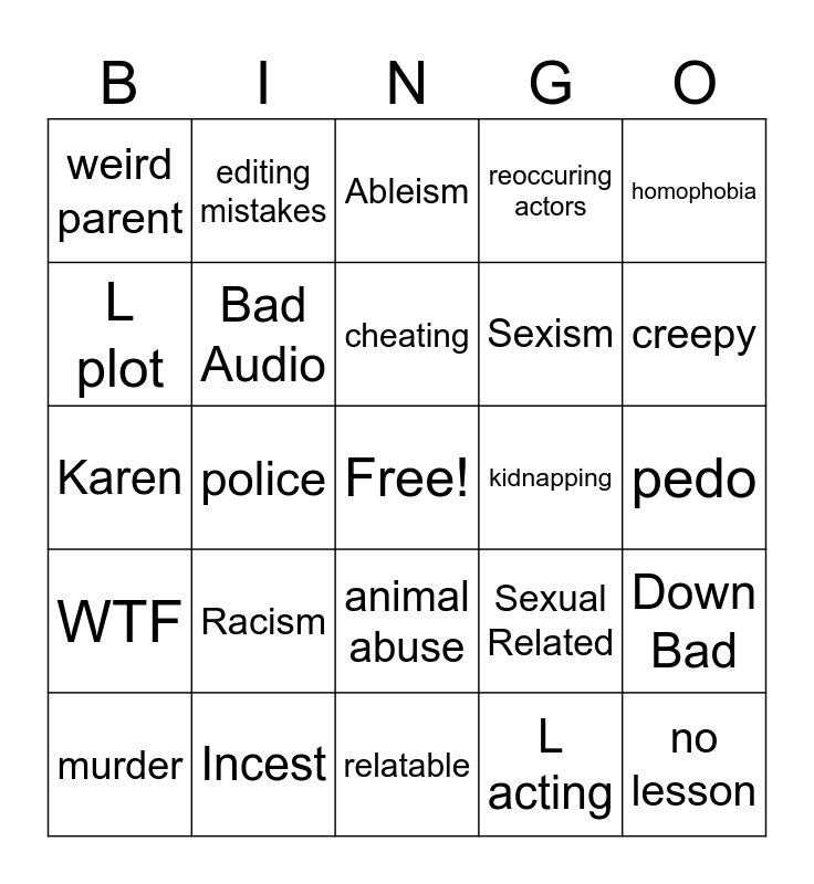 This bingo card has a free space and 24 words: Racism, Incest, cheating, murder, homophobia, weird parent, L plot, editing mistakes, kidnapping, animal abuse, Sexism, Karen, Sexual Related, Down Bad, Bad Audio, L acting, pedo, Ableism, creepy, police, no lesson, WTF, reoccuring actors and relatable.