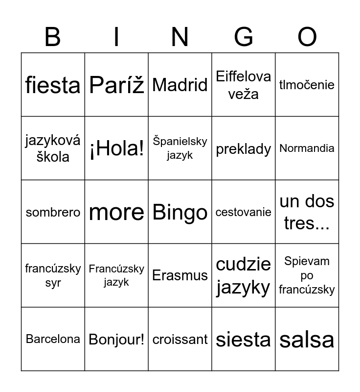 This bingo card has a free space and 24 words: Francúzsky jazyk, Bonjour!, Španielsky jazyk, Barcelona, tlmočenie, fiesta, jazyková škola, Paríž, cestovanie, Erasmus, preklady, sombrero, cudzie jazyky, Spievam po francúzsky, ¡Hola!, siesta, un dos tres..., Madrid, Normandia, more, salsa, francúzsky syr, Eiffelova veža and croissant.