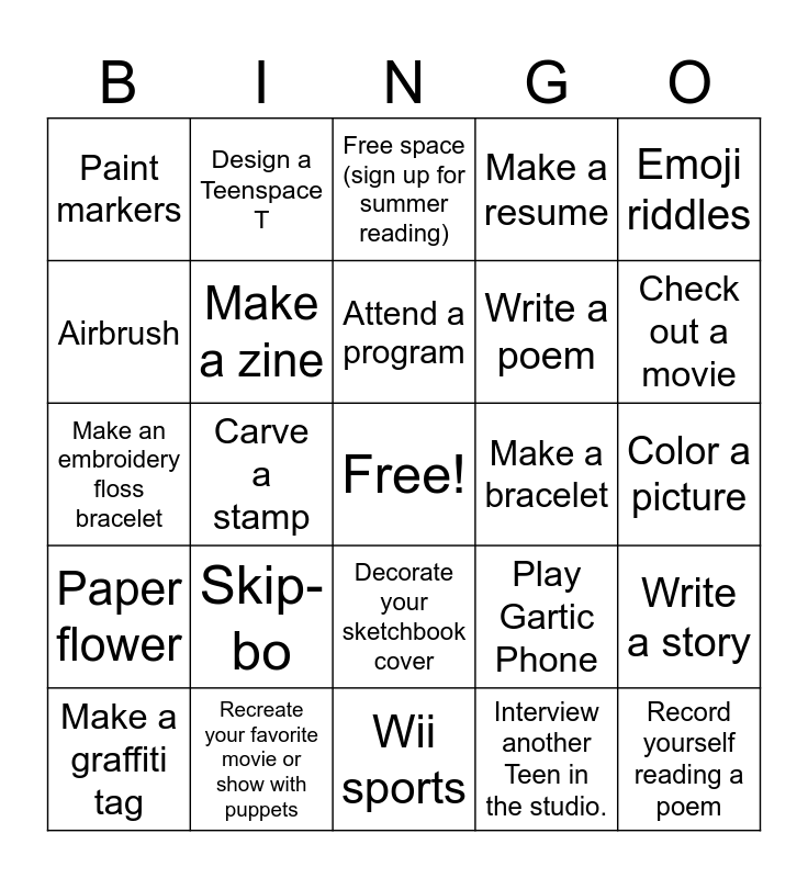 This bingo card has a free space and 83 words: Record a track in the studio, Record a track in the studio, Free space (sign up for summer reading), Read for 15 minutes x 5, Cricut Sticker, Bouncing ball animation, Taco, Cat, Goat, Cheese, Pizza, Build something in Minecraft, Fortnite Victory Royale, Stop motion movie, Collage, Sphero bowling strike, Make a zine, Make a bracelet, Play chess, Paint markers, Make a graffiti tag, Airbrush, Make a beat on the iPad, Sew a stuffie, Create a D&D Character, Write a poem, Record yourself reading a poem, Origami, Carve a stamp, Win at a sports videogame, Lose at a sports videogame, Beat Sam at Mario Party, Play the Switch, Roblox Studio, Skip-bo, Phase-10, Five Second Rule, Make an embroidery floss bracelet, Build something with popsicle sticks, Eat a summer lunch, Wii sports, Check out a book, Check out a movie, Paper flower, Read a manga, Read a nonfiction book, Read a romance, Sphero obstacle course, Take a summer reading book, Decorate a Teenspace tote bag, Design a Teenspace T, Introduce yourself to a teen that you don’t know, Add your birthday to the birthday board, Play a game that you have never played before, Play Gartic Phone, Make a resume, Color a picture, Compliment another teen, Multiplication table race, Wordsearch, Word scramble, Tell your favorite appropriate joke, Recreate your favorite movie or show with puppets, Make a comic on procreate, Draw your favorite character, Do a puzzle, Solve a Rubik cube, Emoji riddles, Create art to hang up in the teenspace, Write a story, Gratitude list, Mindfulness breathing exercise, Create a fidget toy, Write a thank you note, Create fan art, Make a card, Make a gift for a friend, Decorate your sketchbook cover, Interview another Teen in the studio., Make a podcast, Make a poster, Attend a program, Take your photo with the instax camera, Stamp carving, Put an item on hold from another library, Make a car ramp on Roblox Studio and Photo collage.