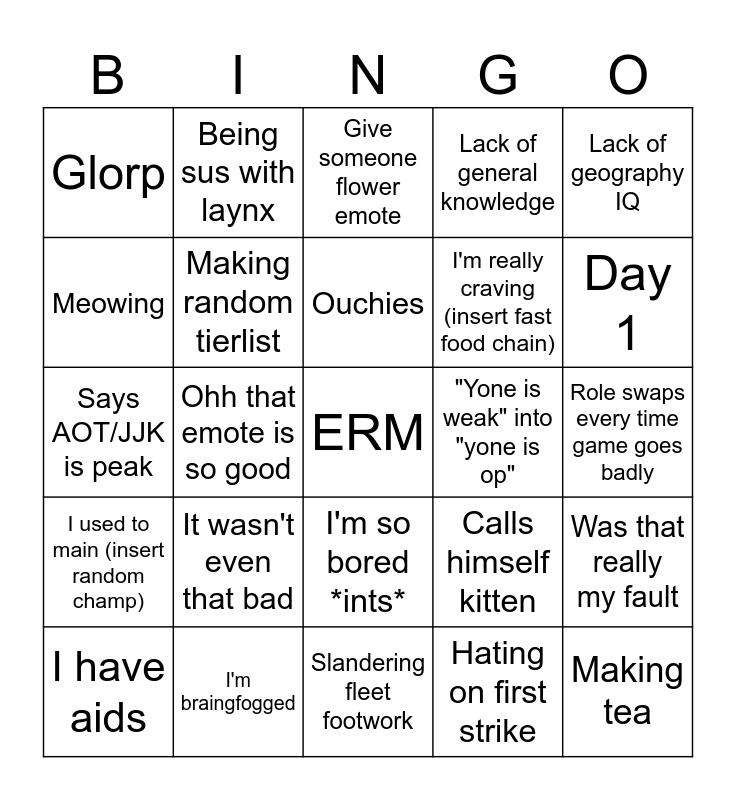 This bingo card has a free space and 24 words: It wasn't even that bad, I'm braingfogged, Ouchies, I have aids, Lack of geography IQ, Glorp, Meowing, Being sus with laynx, "Yone is weak" into "yone is op", I'm so bored *ints*, I'm really craving (insert fast food chain), Says AOT/JJK is peak, Calls himself kitten, Was that really my fault, Making random tierlist, Hating on first strike, Role swaps every time game goes badly, Give someone flower emote, Day 1, Ohh that emote is so good, Making tea, I used to main (insert random champ), Lack of general knowledge and Slandering fleet footwork.