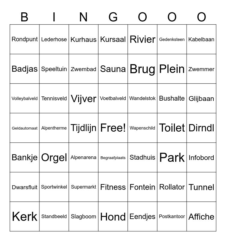This bingo card has a free space and 48 words: Fontein, Plein, Hond, Alpentherme, Vijver, Dirndl, Lederhose, Standbeeld, Gedenksteen, Begraafplaats, Kabelbaan, Kursaal, Bushalte, Wandelstok, Dwarsfluit, Toilet, Badjas, Zwemmer, Rollator, Rivier, Brug, Tijdlijn, Rondpunt, Speeltuin, Tunnel, Zwembad, Glijbaan, Kerk, Voetbalveld, Tennisveld, Postkantoor, Wapenschild, Infobord, Sportwinkel, Geldautomaat, Stadhuis, Park, Volleybalveld, Alpenarena, Supermarkt, Bankje, Affiche, Kurhaus, Slagboom, Sauna, Fitness, Orgel and Eendjes.
