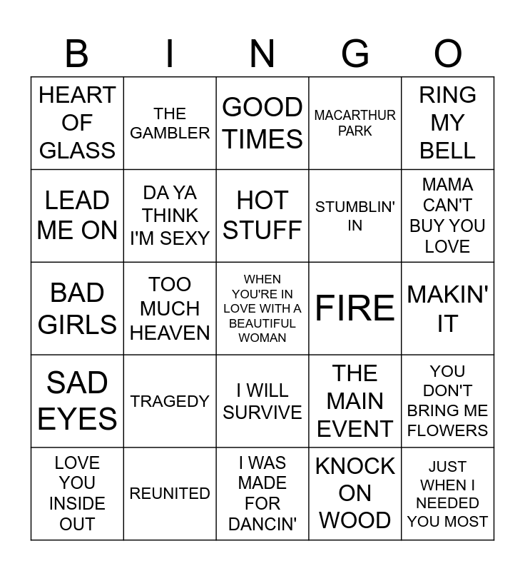 This bingo card has 40 words: MY SHARONA, BAD GIRLS, LE FREAK, DA YA THINK I'M SEXY, REUNITED, I WILL SURVIVE, HOT STUFF, Y.M.C.A, RING MY BELL, SAD EYES, TOO MUCH HEAVEN, MACARTHUR PARK, WHEN YOU'RE IN LOVE WITH A BEAUTIFUL WOMAN, MAKIN' IT, FIRE, TRAGEDY, A LITTLE MORE LOVE, HEART OF GLASS, WHAT A FOOL BELIEVES, GOOD TIMES, YOU DON'T BRING ME FLOWERS, KNOCK ON WOOD, STUMBLIN' IN, LEAD ME ON, SHAKE YOUR BODY, DON'T CRY OUT LOUD, THE LOGICAL SONG, MY LIFE, JUST WHEN I NEEDED YOU MOST, YOU CAN'T CHANGE THAT, I'LL NEVER LOVE THIS WAY AGAIN, LOVE YOU INSIDE OUT, I WANT YOU TO WANT ME, THE MAIN EVENT, MAMA CAN'T BUY YOU LOVE, I WAS MADE FOR DANCIN', AFTER THE LOVE HAS GONE, HEAVEN KNOWS, THE GAMBLER and SHAKE YOUR GROOVE THING.