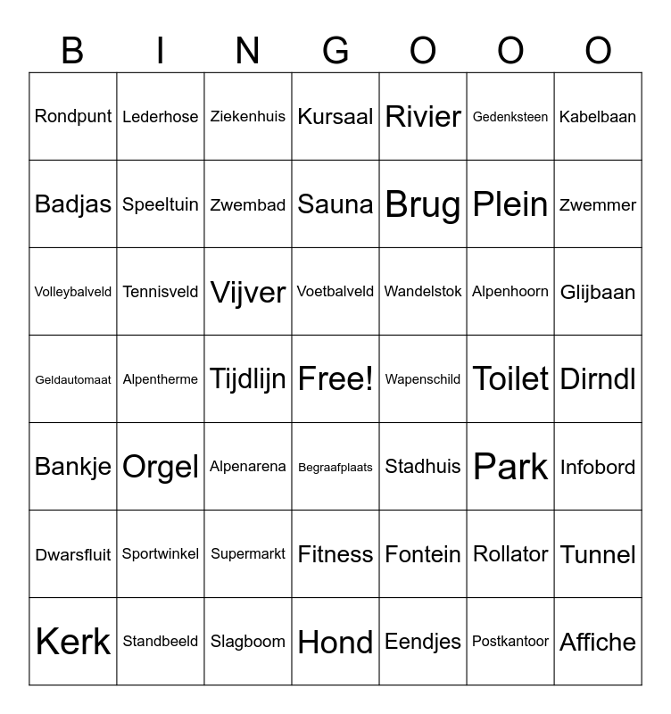 This bingo card has a free space and 48 words: Fontein, Plein, Hond, Alpentherme, Vijver, Dirndl, Lederhose, Standbeeld, Gedenksteen, Begraafplaats, Kabelbaan, Kursaal, Alpenhoorn, Wandelstok, Dwarsfluit, Toilet, Badjas, Zwemmer, Rollator, Rivier, Brug, Tijdlijn, Rondpunt, Speeltuin, Tunnel, Zwembad, Glijbaan, Kerk, Voetbalveld, Tennisveld, Postkantoor, Wapenschild, Infobord, Sportwinkel, Geldautomaat, Stadhuis, Park, Volleybalveld, Alpenarena, Supermarkt, Bankje, Affiche, Ziekenhuis, Slagboom, Sauna, Fitness, Orgel and Eendjes.
