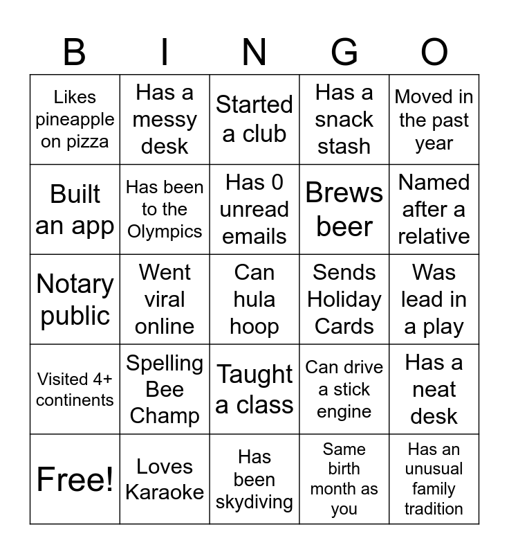 This bingo card has 29 words: Free!, Knows ASL, Went viral online, Has an unusual family tradition, Likes pineapple on pizza, Started a club, Has been to the Olympics, Spelling Bee Champ, Sends Holiday Cards, Loves Karaoke, Was lead in a play, Can hula hoop, Has been skydiving, Same birth month as you, Named after a relative, Has a bucket list, Taught a class, Visited 4+ continents, Moved in the past year, Notary public, Can drive a stick engine, Ran in a marathon, Brews beer, Built an app, Has a snack stash, Has a messy desk, Has a neat desk, Has 0 unread emails and Buys coffee every morning.