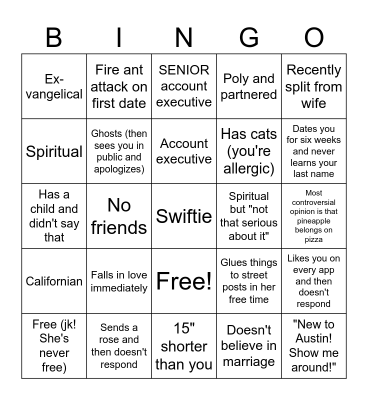 This bingo card has 26 words: Free!, Doesn't believe in marriage, Account executive, Sends a rose and then doesn't respond, Recently split from wife, Ex-vangelical, Spiritual, Fire ant attack on first date, Most controversial opinion is that pineapple belongs on pizza, Glues things to street posts in her free time, Has cats (you're allergic), Has a child and didn't say that, Likes you on every app and then doesn't respond, Free (jk! She's never free), No friends, Ghosts (regular edition), Poly and partnered, Californian, SENIOR account executive, Swiftie, Dates you for six weeks and never learns your last name, 15" shorter than you, Spiritual but "not that serious about it", Falls in love immediately, Ghosts (then sees you in public and apologizes) and "New to Austin! Show me around!".