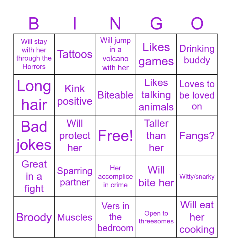 This bingo card has a free space and 24 words: Sparring partner, Muscles, Biteable, Broody, Drinking buddy, Will stay with her through the Horrors, Long hair, Tattoos, Taller than her, Her accomplice in crime, Likes talking animals, Bad jokes, Will bite her, Witty/snarky, Kink positive, Open to threesomes, Fangs?, Will jump in a volcano with her, Loves to be loved on, Will protect her, Will eat her cooking, Great in a fight, Likes games and Vers in the bedroom.