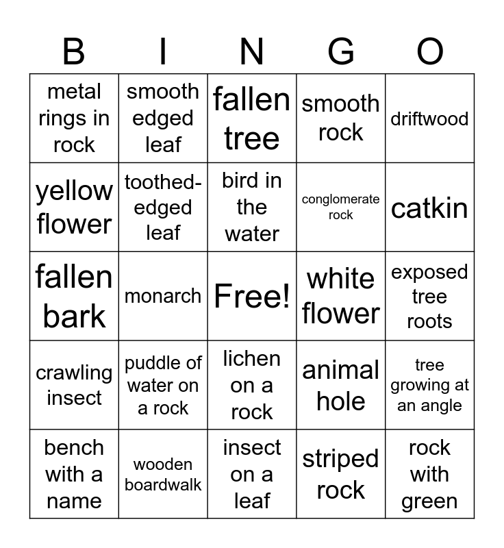 This bingo card has a free space and 41 words: Birdseed, fallen bark, tree cage, toothed-edged leaf, wooden boardwalk, lichen on a rock, bird in the water, log stack, driftwood, crawling insect, monarch, smooth rock, rock with green, exposed tree roots, white flower, puddle of water on a rock, plant growing out of the rock, metal rings in rock, flying bird, fallen tree, tree growing at an angle, rock vein, insect on a leaf, conglomerate rock, singing bird, vesicular rock, striped rock, small mammal, catkin, thorny plant, root cellar, smooth edged leaf, bench with a name, animal track or scat, animal hole, yellow flower, purple flower, pinecone, speckled tree, leaf with two different colors and tree shorter than you.