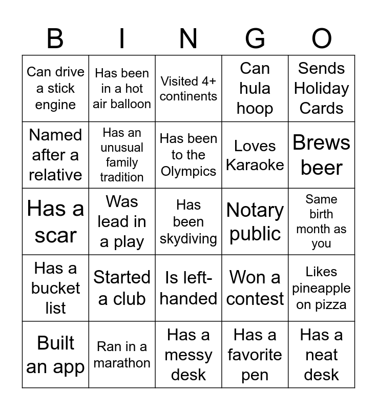 This bingo card has 38 words: Free!, Knows ASL, Went viral online, Has an unusual family tradition, Likes pineapple on pizza, Started a club, Has been to the Olympics, Spelling Bee Champ, Sends Holiday Cards, Loves Karaoke, Was lead in a play, Can hula hoop, Has been skydiving, Same birth month as you, Named after a relative, Has a bucket list, Taught a class, Visited 4+ continents, Moved in the past year, Notary public, Can drive a stick engine, Ran in a marathon, Brews beer, Built an app, Has a snack stash, Has a messy desk, Has a neat desk, Has 0 unread emails, Buys coffee every morning, Was one of the original employees, Has an exotic pet, Is left-handed, Has a favorite pen, Has been in a hot air balloon, Owns a vacation home, Won a contest, Has a scar and Has been skydiving.