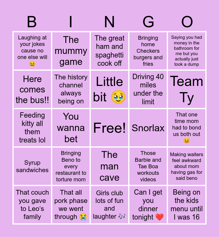 This bingo card has a free space and 24 words: Bringing Beno to every restaurant to torture mom, That all pork phase we went through 😭, Little bit 🥹, That couch you gave to Leo’s family, Saying you had money in the bathroom for me but you actually just took a dump, Laughing at your jokes cause no one else will 😆, Here comes the bus!!, The mummy game, Snorlax, The man cave, Driving 40 miles under the limit, Feeding kitty all them treats lol, Those Barbie and Tae Boa workouts videos, Making waiters feel awkward about mom having gas for said beno, The history channel always being on, Can I get you dinner tonight ❤️, That one time mom had to bond us both out 😆, The great ham and spaghetti cook off, Team Ty, You wanna bet, Being on the kids menu until I was 16, Syrup sandwiches, Bringing home Checkers burgers and fries and Girls club lots of fun and laughter 🎶.
