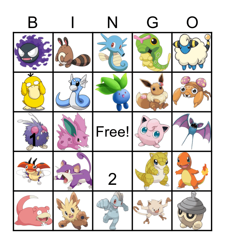 This bingo card has 54 images, a free space and 2 words: 2 and 1.