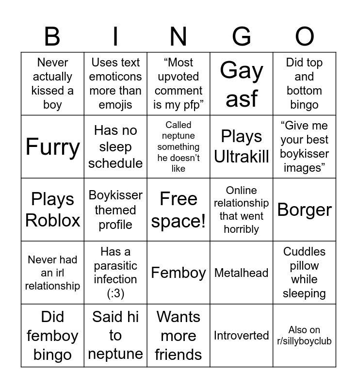 This bingo card has a free space and 24 words: Has a parasitic infection (:3), Said hi to neptune, Called neptune something he doesn’t like, Did femboy bingo, Did top and bottom bingo, Never actually kissed a boy, Furry, Uses text emoticons more than emojis, Online relationship that went horribly, Femboy, Plays Ultrakill, Plays Roblox, Metalhead, Cuddles pillow while sleeping, Has no sleep schedule, Introverted, Borger, “Most upvoted comment is my pfp”, “Give me your best boykisser images”, Boykisser themed profile, Also on r/sillyboyclub, Never had an irl relationship, Gay asf and Wants more friends.