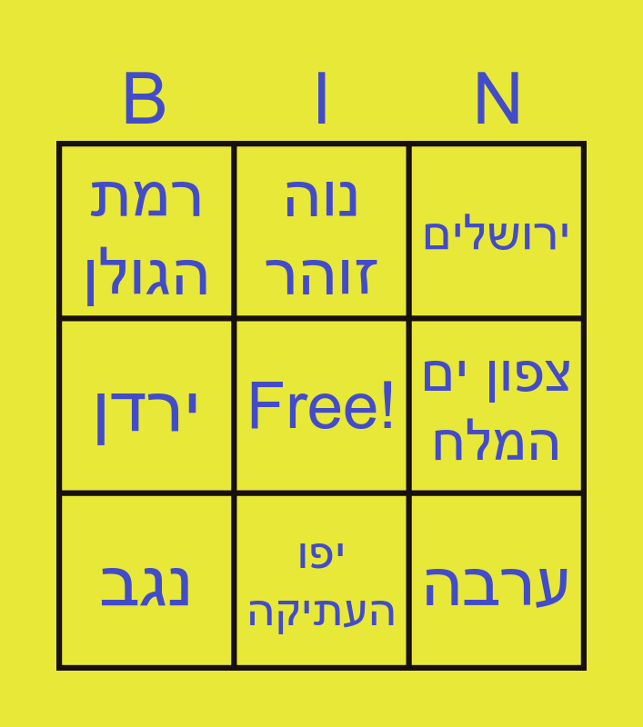 This bingo card has a free space and 17 words: שביל ישראל, גליל מערבי, צפון ים המלח, רמת הגולן, הגנים הבהאים, ירדן, מצדה, ערבה, נגב, יפו העתיקה, נחל ערוגות, צפת, נוה זוהר, ירושלים, תל אביב, באר שבע and עמק יזרעל.