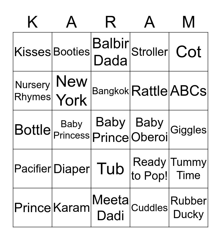 This bingo card has 25 words: Diaper, Meeta Dadi, Bangkok, Prince, Cot, Kisses, Nursery Rhymes, Booties, Baby Oberoi, Tub, Rattle, Bottle, Ready to Pop!, Tummy Time, New York, Rubber Ducky, Giggles, Balbir Dada, ABCs, Baby Princess, Baby Prince, Karam, Pacifier, Stroller and Cuddles.
