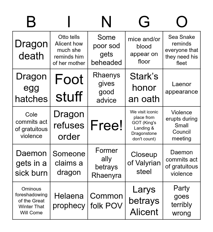 This bingo card has a free space and 24 words: Someone claims a dragon, Helaena prophecy, Rhaenys gives good advice, Ominous foreshadowing of the Great Winter That Will Come, Sea Snake reminds everyone that they need his fleet, Dragon death, Dragon egg hatches, Otto tells Alicent how much she reminds him of her mother, We visit iconic place from GOT (King's Landing & Dragonstone don't count), Former ally betrays Rhaenyra, Stark’s honor an oath, Cole commits act of gratuitous violence, Closeup of Valyrian steel, Daemon commits act of gratuitous violence, Foot stuff, Larys betrays Alicent, Violence erupts during Small Council meeting, Some poor sod gets beheaded, Laenor appearance, Dragon refuses order, Party goes terribly wrong, Daemon gets in a sick burn, mice and/or blood appear on floor and Common folk POV.