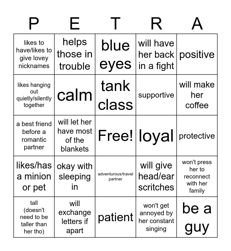 This bingo card has a free space and 24 words: okay with sleeping in, will exchange letters if apart, tank class, tall (doesn't need to be taller than her tho), positive, likes to have/likes to give lovey nicknames, likes hanging out quietly/silently together, helps those in trouble, loyal, adventurous/travel partner, supportive, a best friend before a romantic partner, will give head/ear scritches, won't press her to reconnect with her family, calm, won't get annoyed by her constant singing, protective, blue eyes, will make her coffee, will let her have most of the blankets, be a guy, likes/has a minion or pet, will have her back in a fight and patient.
