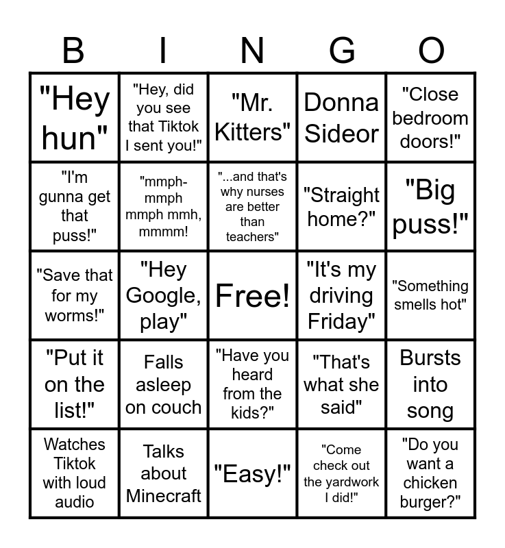 This bingo card has a free space and 24 words: Falls asleep on couch, Talks about Minecraft, "...and that's why nurses are better than teachers", Watches Tiktok with loud audio, "Close bedroom doors!", "Hey hun", "I'm gunna get that puss!", "Hey, did you see that Tiktok I sent you!", "It's my driving Friday", "Have you heard from the kids?", "Straight home?", "Save that for my worms!", "That's what she said", Bursts into song, "mmph-mmph mmph mmh, mmmm!, "Come check out the yardwork I did!", "Something smells hot", "Mr. Kitters", "Big puss!", "Hey Google, play", "Do you want a chicken burger?", "Put it on the list!", Donna Sideor and "Easy!".