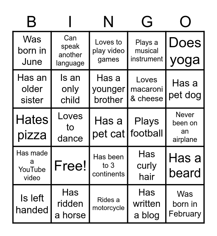 This bingo card has 25 words: Free!, Rides a motorcycle, Has a younger brother, Is left handed, Does yoga, Was born in June, Has an older sister, Can speak another language, Plays football, Has been to 3 continents, Loves macaroni & cheese, Hates pizza, Has curly hair, Has a beard, Is an only child, Was born in February, Never been on an airplane, Loves to play video games, Has a pet dog, Loves to dance, Has a pet cat, Has ridden a horse, Has made a YouTube video, Plays a musical instrument and Has written a blog.