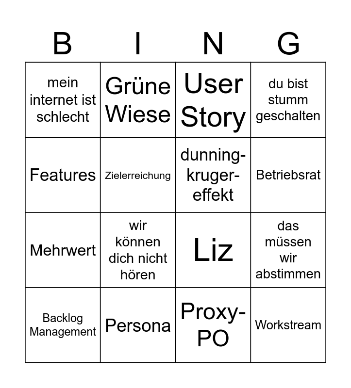 This bingo card has 16 words: Persona, das müssen wir abstimmen, User Story, mein internet ist schlecht, Mehrwert, Grüne Wiese, Liz, Proxy-PO, Features, Zielerreichung, Backlog Management, du bist stumm geschalten, wir können dich nicht hören, Betriebsrat, dunning-kruger-effekt and Workstream.
