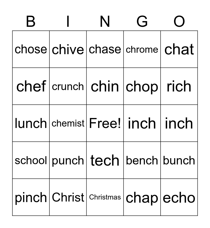 This bingo card has a free space and 24 words: pinch, punch, chin, chap, chat, chose, chive, chase, inch, inch, lunch, crunch, bench, bunch, chef, Christ, Christmas, chrome, rich, school, chemist, tech, chop and echo.