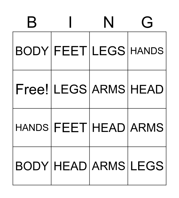 This bingo card has 16 words: HEAD, ARMS, LEGS, BODY, HANDS, FEET, HEAD, ARMS, Free!, LEGS, BODY, HANDS, FEET, HEAD, ARMS and LEGS.