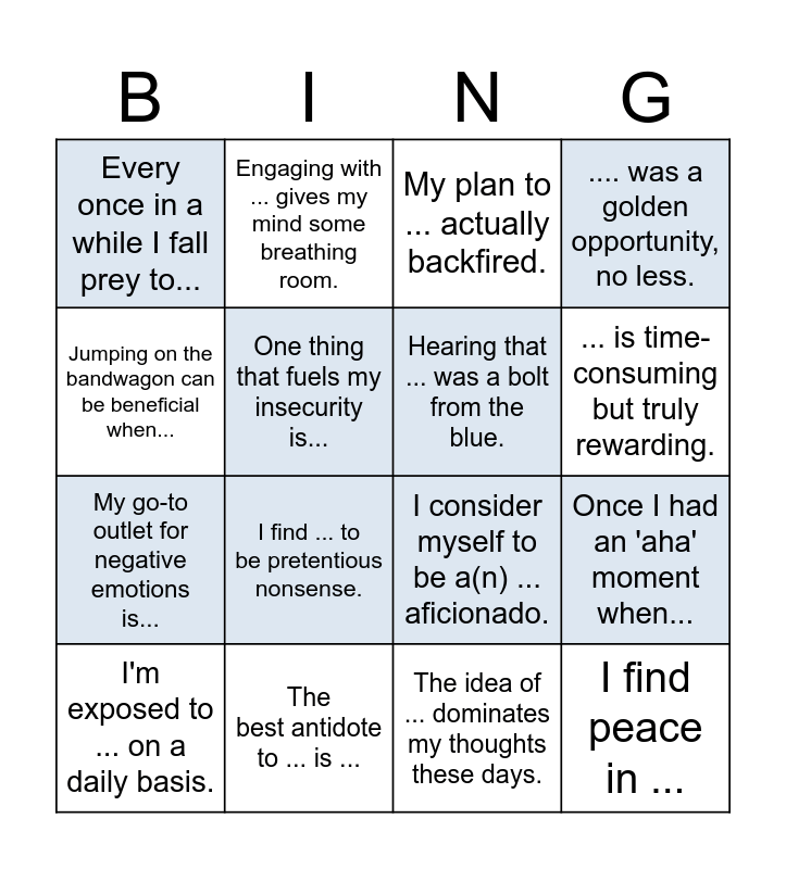 This bingo card has 16 words: The best antidote to ... is ..., Once I had an 'aha' moment when..., My plan to ... actually backfired., Every once in a while I fall prey to..., My go-to outlet for negative emotions is..., Engaging with ... gives my mind some breathing room., I consider myself to be a(n) ... aficionado., The idea of ... dominates my thoughts these days., Jumping on the bandwagon can be beneficial when..., One thing that fuels my insecurity is..., I'm exposed to ... on a daily basis., .... was a golden opportunity, no less., I find ... to be pretentious nonsense., ... is time-consuming but truly rewarding., Hearing that ... was a bolt from the blue. and I find peace in ....