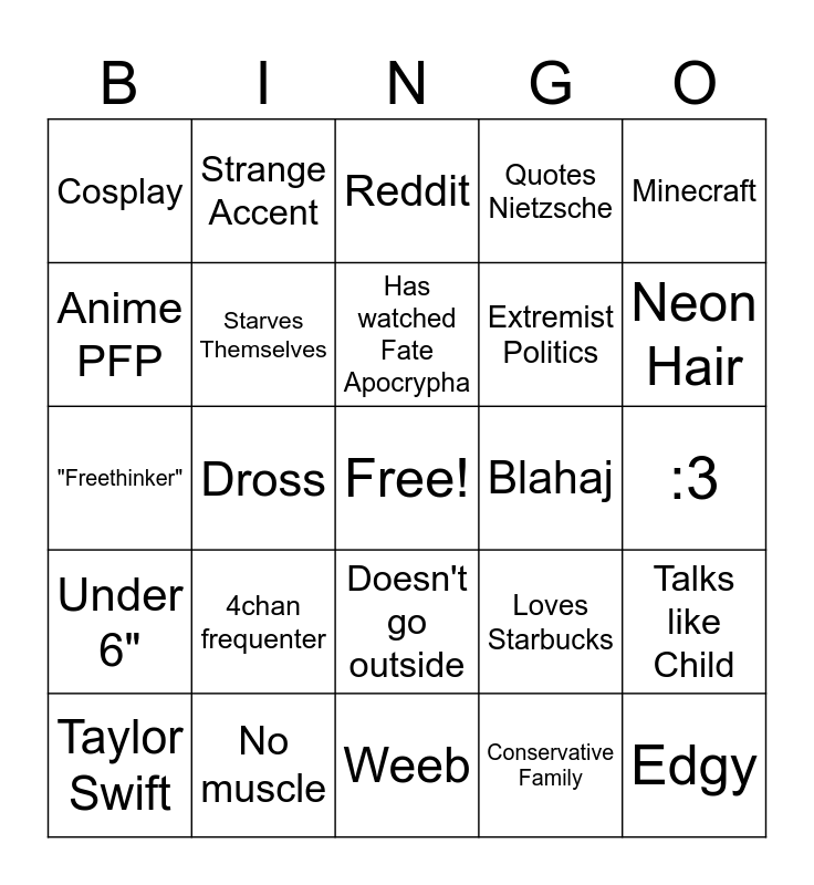 This bingo card has a free space and 24 words: 4chan frequenter, No muscle, Has watched Fate Apocrypha, Taylor Swift, Minecraft, Cosplay, Anime PFP, Strange Accent, Blahaj, Doesn't go outside, Extremist Politics, "Freethinker", Loves Starbucks, Talks like Child, Starves Themselves, Conservative Family, :3, Reddit, Neon Hair, Dross, Edgy, Under 6", Quotes Nietzsche and Weeb.