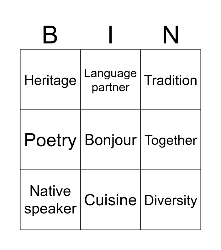 This bingo card has 15 words: GEDI Council, Merci, Tradition, Heritage, Cuisine, Bonjour, Multilingual, Empathy, Together, Diversity, Inclusion, Poetry, Native speaker, Language partner and Learning & Development.