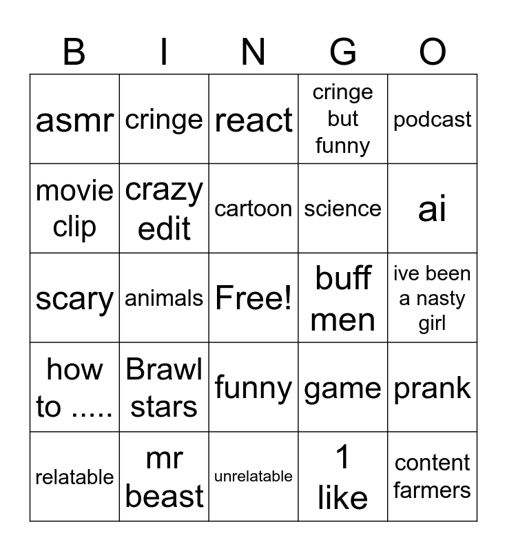 This bingo card has a free space and 24 words: Brawl stars, mr beast, cartoon, relatable, podcast, asmr, movie clip, cringe, buff men, funny, science, scary, game, prank, crazy edit, 1 like, ive been a nasty girl, react, ai, animals, content farmers, how to ....., cringe but funny and unrelatable.