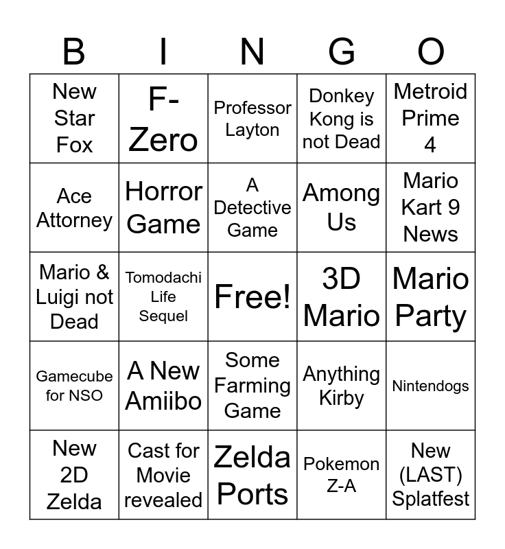 This bingo card has a free space and 24 words: A New Amiibo, Cast for Movie revealed, A Detective Game, New 2D Zelda, Metroid Prime 4, New Star Fox, Ace Attorney, F-Zero, 3D Mario, Some Farming Game, Among Us, Mario & Luigi not Dead, Anything Kirby, Nintendogs, Horror Game, Pokemon Z-A, Mario Party, Professor Layton, Mario Kart 9 News, Tomodachi Life Sequel, New (LAST) Splatfest, Gamecube for NSO, Donkey Kong is not Dead and Zelda Ports.
