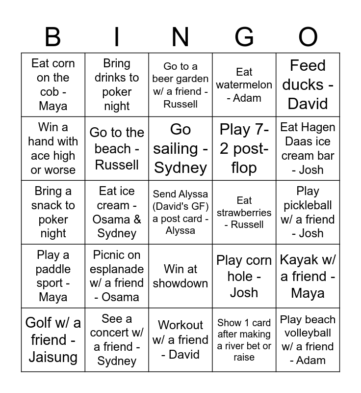 This bingo card has a free space and 36 words: Walk in Middlesex Fells Reservation - Bridget, Kayak - Osama, Be on a boat - Adam, Go to the beach - Russell, Play corn hole - Josh, Play a paddle sport - Maya, Go sailing - Sydney, Swim in a lake - Jaisung, Feed ducks - David, Eat a cheeseburger - Bridget & Jaisung, Eat ice cream - Osama & Sydney, Eat watermelon - Adam, Eat lobster - David, Eat strawberries - Russell, Eat Hagen Daas ice cream bar - Josh, Eat corn on the cob - Maya, Lounge in the pool w/ a friend - Bridget, Picnic on esplanade w/ a friend - Osama, Play beach volleyball w/ a friend - Adam, Go to a beer garden w/ a friend - Russell, Play pickleball w/ a friend - Josh, Kayak w/ a friend - Maya, See a concert w/ a friend - Sydney, Golf w/ a friend - Jaisung, Workout w/ a friend - David, Bring drinks to poker night, Bring a snack to poker night, Wear an awesome outfit to poker night, Play 7-2 post-flop, Win a hand with ace high or worse, Go all-in, Call a past poker night attendee to explain a hand, Show 1 card after making a river bet or raise, Win at showdown, Win before showdown and Lose at showdown.
