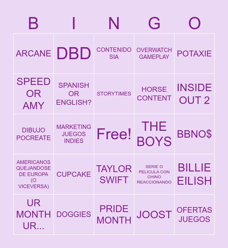 This bingo card has a free space and 24 words: CUPCAKE, DOGGIES, STORYTIMES, UR MONTH UR..., POTAXIE, ARCANE, SPEED OR AMY, DBD, THE BOYS, TAYLOR SWIFT, HORSE CONTENT, DIBUJO POCREATE, SERIE O PELICULA CON CHINO REACCIONANDO, BILLIE EILISH, SPANISH OR ENGLISH?, JOOST, BBNO$, CONTENIDO SIA, INSIDE OUT 2, MARKETING JUEGOS INDIES, OFERTAS JUEGOS, AMERICANOS QUEJANDOSE DE EUROPA (O VICEVERSA), OVERWATCH GAMEPLAY and PRIDE MONTH.
