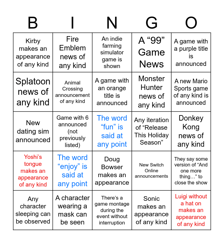 This bingo card has a free space and 24 words: The word “enjoy” is said at any point, A character wearing a mask can be seen, A game with an orange title is announced, Any character sleeping can be observed, A game with a purple title is announced, Kirby makes an appearance of any kind, Splatoon news of any kind, Fire Emblem news of any kind, Any iteration of “Release This Holiday Season”, Doug Bowser makes an appearance, Monster Hunter news of any kind, New dating sim announced, New Switch Online announcements, They say some version of “And one more thing…” to close the show, Animal Crossing announcement of any kind, Sonic makes an appearance of any kind, Donkey Kong news of any kind, An indie farming simulator game is shown, A new Mario Sports game of any kind is announced, Game with 6 announced (not previously listed), Luigi without a hat on makes an appearance of any kind, Yoshi’s tongue makes an appearance of any kind, A “99” Game News and There’s a game montage during the event without interruption.