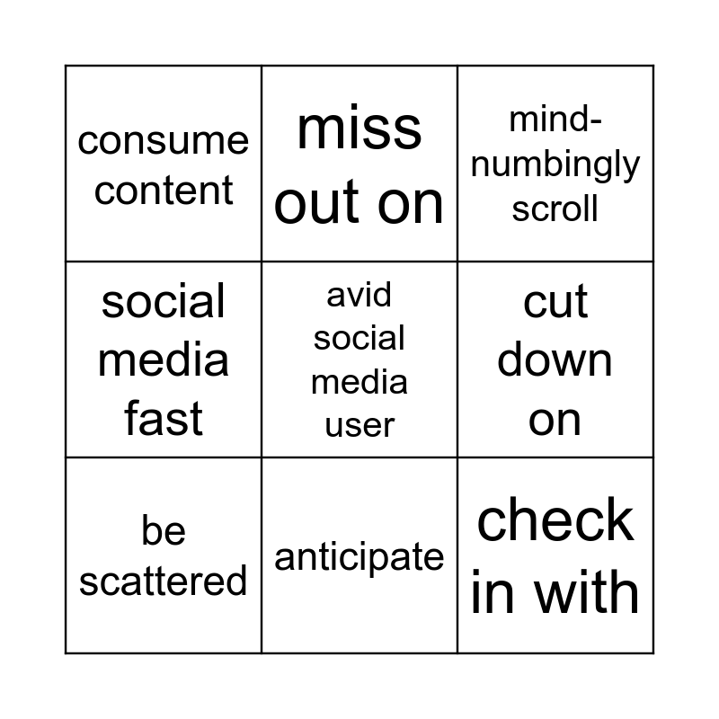 This bingo card has a free space and 8 words: cut down on, mind-numbingly scroll, miss out on, be scattered, consume content, check in with, social media fast and anticipate.
