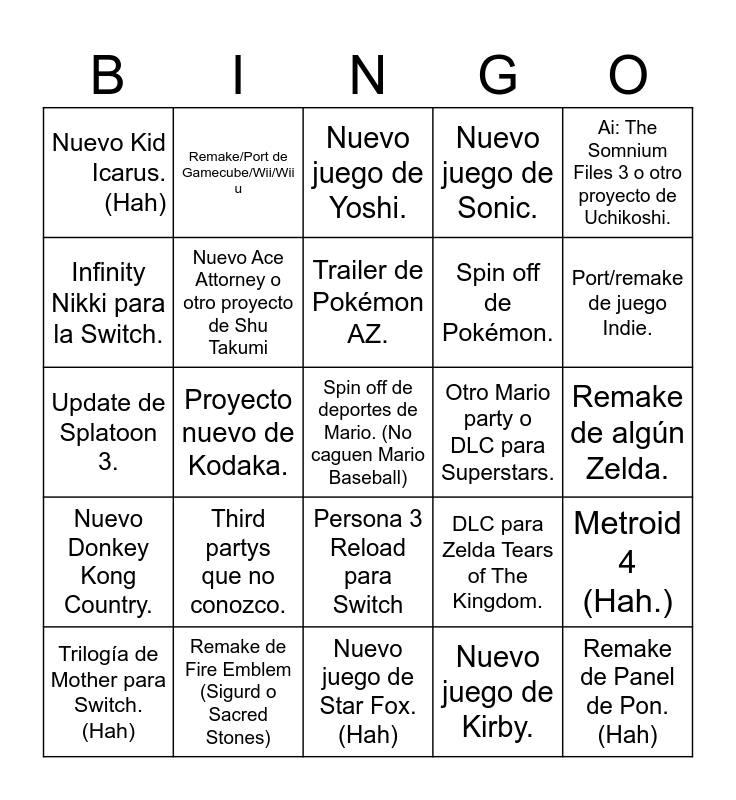 This bingo card has a free space and 24 words: Third partys que no conozco., Remake de Fire Emblem (Sigurd o Sacred Stones), Trailer de Pokémon AZ., Trilogía de Mother para Switch. (Hah), Ai: The Somnium Files 3 o otro proyecto de Uchikoshi., Nuevo Kid Icarus. (Hah), Infinity Nikki para la Switch., Remake/Port de Gamecube/Wii/Wii u, Otro Mario party o DLC para Superstars., Persona 3 Reload para Switch, Spin off de Pokémon., Update de Splatoon 3., DLC para Zelda Tears of The Kingdom., Metroid 4 (Hah.), Nuevo Ace Attorney o otro proyecto de Shu Takumi, Nuevo juego de Kirby., Remake de algún Zelda., Nuevo juego de Yoshi., Port/remake de juego Indie., Proyecto nuevo de Kodaka., Remake de Panel de Pon. (Hah), Nuevo Donkey Kong Country., Nuevo juego de Sonic. and Nuevo juego de Star Fox. (Hah).