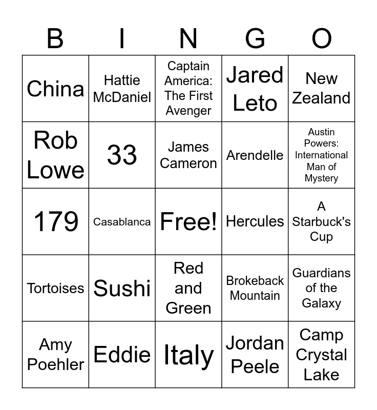 This bingo card has a free space and 24 words: Sushi, Eddie, James Cameron, Amy Poehler, New Zealand, China, Rob Lowe, Hattie McDaniel, Hercules, Red and Green, Arendelle, 179, Brokeback Mountain, Guardians of the Galaxy, 33, Jordan Peele, A Starbuck's Cup, Captain America: The First Avenger, Austin Powers: International Man of Mystery, Casablanca, Camp Crystal Lake, Tortoises, Jared Leto and Italy.