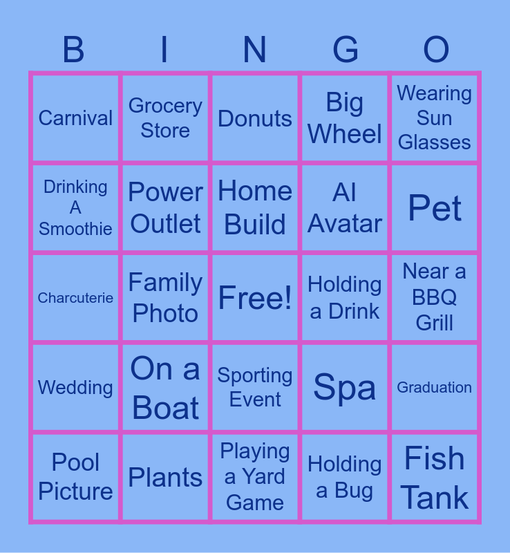 This bingo card has a free space and 29 words: Pool Picture, Concert, Family Photo, Painting, Carnival, Donuts, Power Outlet, On a Boat, Holding a Drink, Plants, Near a BBQ Grill, Fish Tank, Playing a Yard Game, Holding a Bug, Pet, Fireworks, Sporting Event, Wedding, Wearing Sun Glasses, Charcuterie, Spa, Picnic, AI Avatar, Drinking A Smoothie, Big Wheel, Grocery Store, Graduation, Home Build and Birthday.