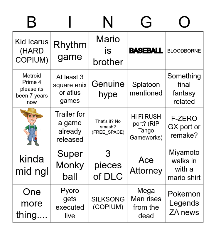 This bingo card has 1 images, a free space and 23 words: Super Monky ball, Pyoro gets executed live, Genuine hype, One more thing...., BLOODBORNE, Kid Icarus (HARD COPIUM), Metroid Prime 4 please its been 7 years now, Rhythm game, Hi Fi RUSH port? (RIP Tango Gameworks), 3 pieces of DLC, Splatoon mentioned, Ace Attorney, Miyamoto walks in with a mario shirt, At least 3 square enix or atlus games, Mega Man rises from the dead, F-ZERO GX port or remake?, Mario is brother, Something final fantasy related, Trailer for a game already released, Pokemon Legends ZA news, kinda mid ngl, BASEBALL and SILKSONG (COPIUM).