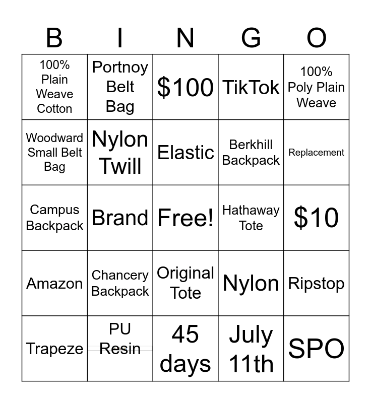 This bingo card has 1 images, a free space and 24 words: Chancery Backpack, PU Resin, Elastic, Trapeze, 100% Poly Plain Weave, 100% Plain Weave Cotton, Woodward Small Belt Bag, Portnoy Belt Bag, Hathaway Tote, Original Tote, Berkhill Backpack, Campus Backpack, Nylon, Ripstop, Nylon Twill, July 11th, $10, $100, Replacement, Brand, SPO, Amazon, TikTok and 45 days.