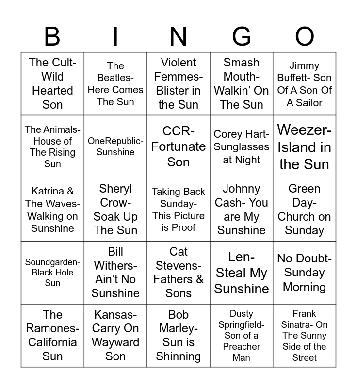 This bingo card has 26 words: Cat Stevens- Fathers & Sons, Dusty Springfield- Son of a Preacher Man, CCR- Fortunate Son, Kansas- Carry On Wayward Son, Jimmy Buffett- Son Of A Son Of A Sailor, The Cult- Wild Hearted Son, The Animals- House of The Rising Sun, The Beatles- Here Comes The Sun, Green Day- Church on Sunday, Len- Steal My Sunshine, Corey Hart- Sunglasses at Night, Katrina & The Waves- Walking on Sunshine, No Doubt- Sunday Morning, The Ramones- California Sun, Sheryl Crow- Soak Up The Sun, Shawn Colvin- Sunny Came Home, Smash Mouth- Walkin’ On The Sun, Soundgarden- Black Hole Sun, Violent Femmes- Blister in the Sun, Taking Back Sunday- This Picture is Proof, Weezer- Island in the Sun, Bob Marley- Sun is Shinning, Johnny Cash- You are My Sunshine, Bill Withers- Ain’t No Sunshine, OneRepublic-Sunshine and Frank Sinatra- On The Sunny Side of the Street.