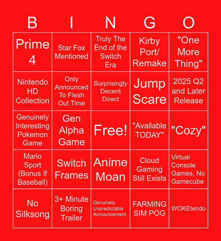 This bingo card has a free space and 24 words: Switch Frames, 3+ Minute Boring Trailer, Surprisingly Decent Direct, No Silksong, "One More Thing", Prime 4, Nintendo HD Collection, Star Fox Mentioned, "Available TODAY", Anime Moan, Jump Scare, Genuinely Interesting Pokemon Game, Cloud Gaming Still Exists, Virtual Console Games, No Gamecube, Only Announced To Flesh Out Time, FARMING SIM POG, "Cozy", Truly The End of the Switch Era, 2025 Q2 and Later Release, Gen Alpha Game, WOKEtendo, Mario Sport (Bonus If Baseball), Kirby Port/ Remake and Genuinely Unpredictable Announcement.