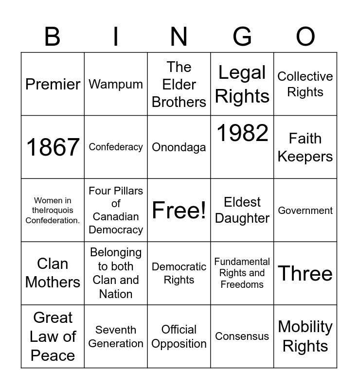 This bingo card has a free space and 34 words: The Grand Council of the Iroquois, Consensus, Negative points of consensus, Positive points of consensus, Clan Mothers, Confederacy, Collective Rights, Great Law of Peace, Wampum, The Hiawatha Wampum, Onondaga, The Elder Brothers, The Three Sisters, Men's Responsibilities in the Confederacy, Eldest Daughter, Faith Keepers, Seventh Generation, Women in theIroquois Confederation., Belonging to both Clan and Nation, Fundamental Rights and Freedoms, Democratic Rights, Legislative Body, Premier, Government, Official Opposition, Mobility Rights, Legal Rights, Equality Rights, 1982, 1867, Constitution, Four Pillars of Canadian Democracy, Three and The Magna Carta.
